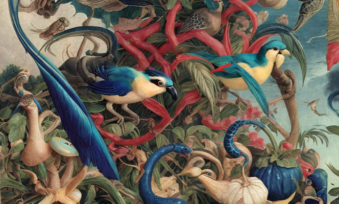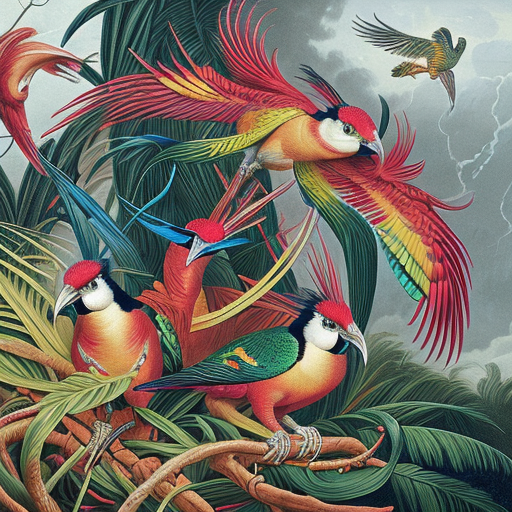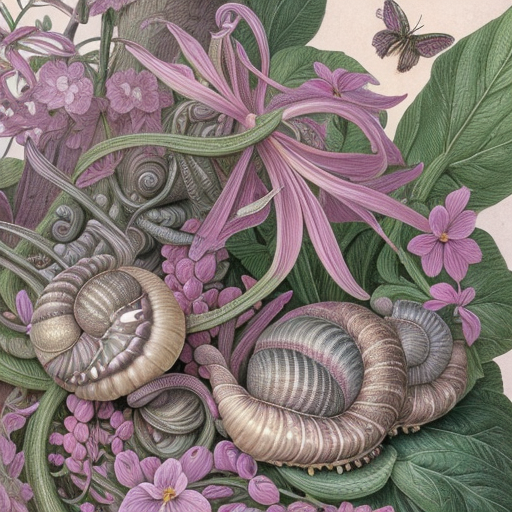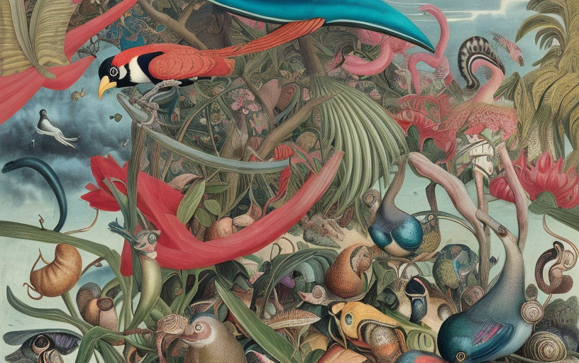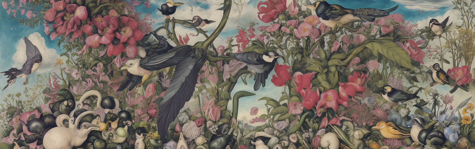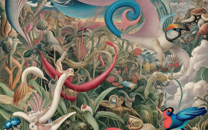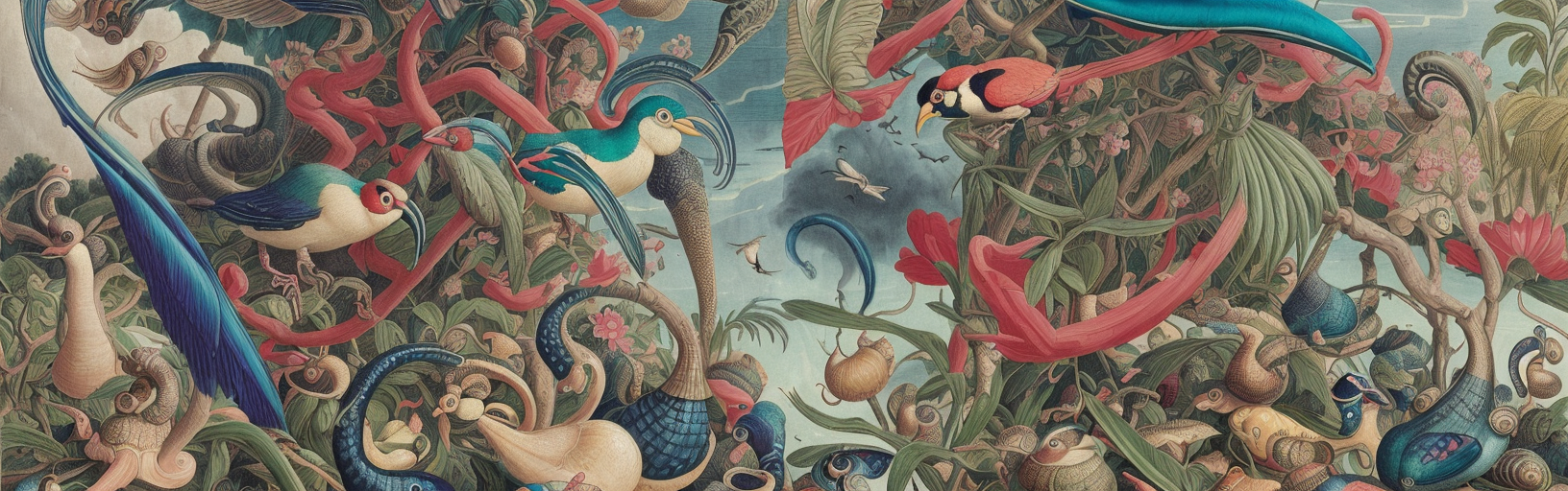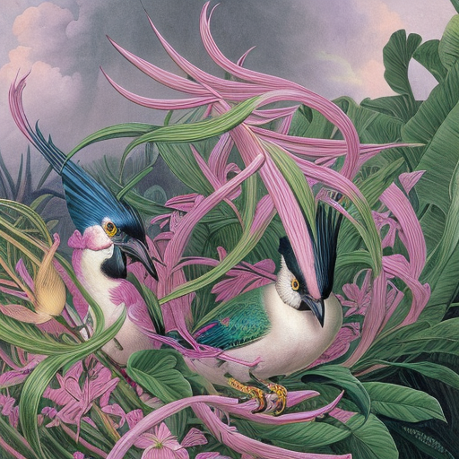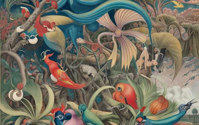 gave in various prompts - menitoning Audubon, Otto Dix, garden of Eden, snails, exotic birds etc.