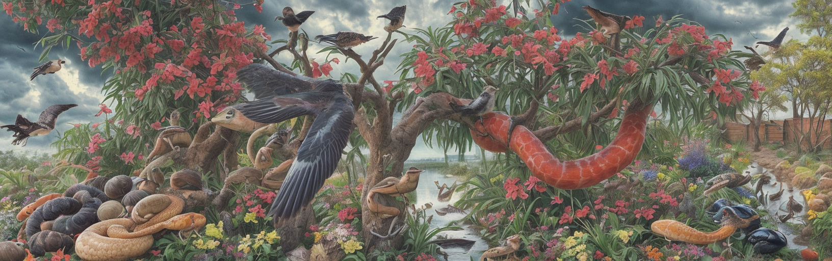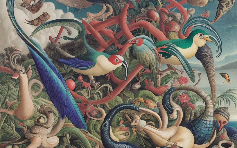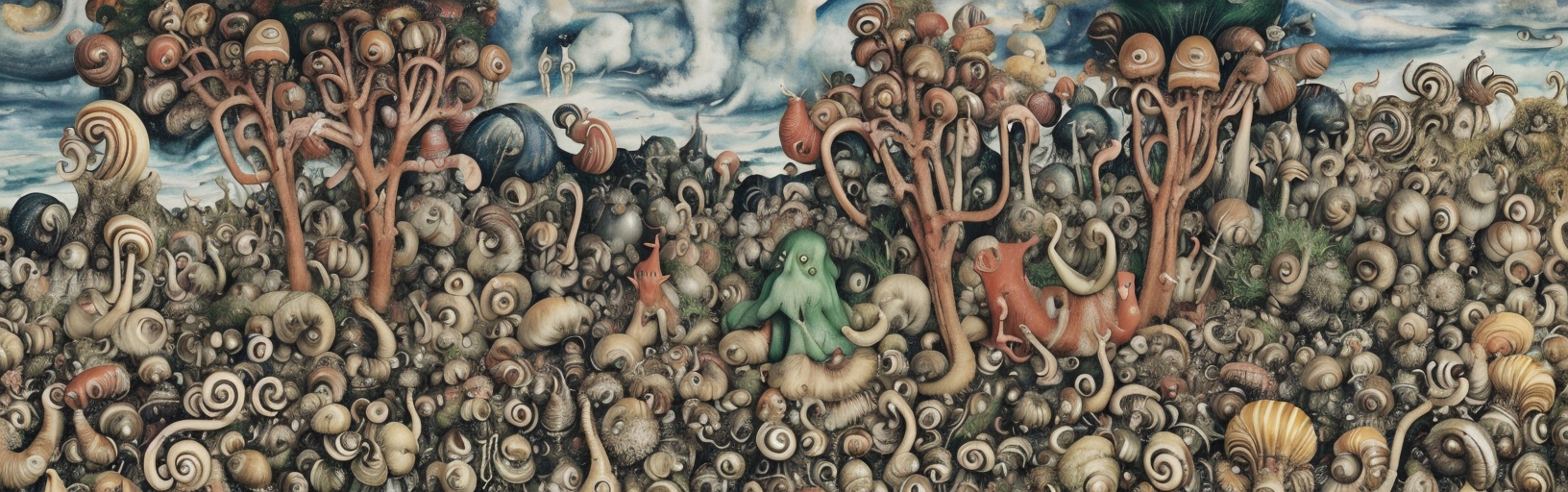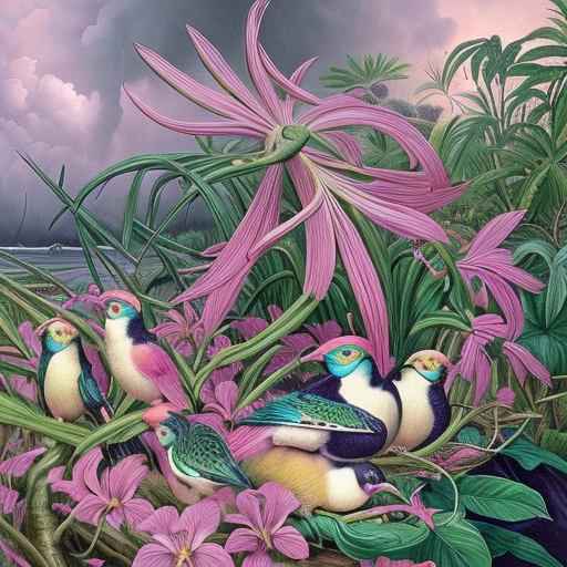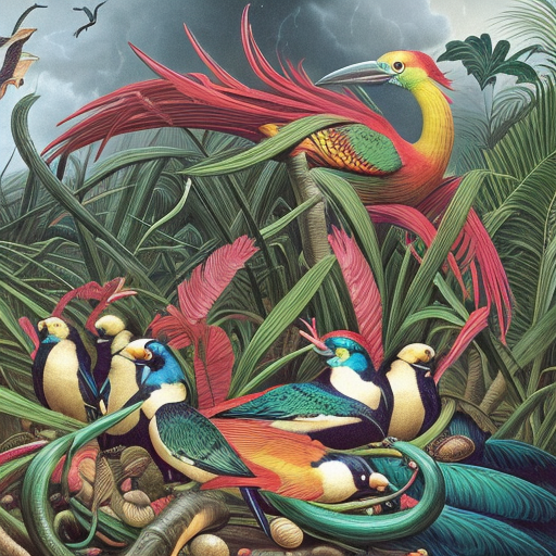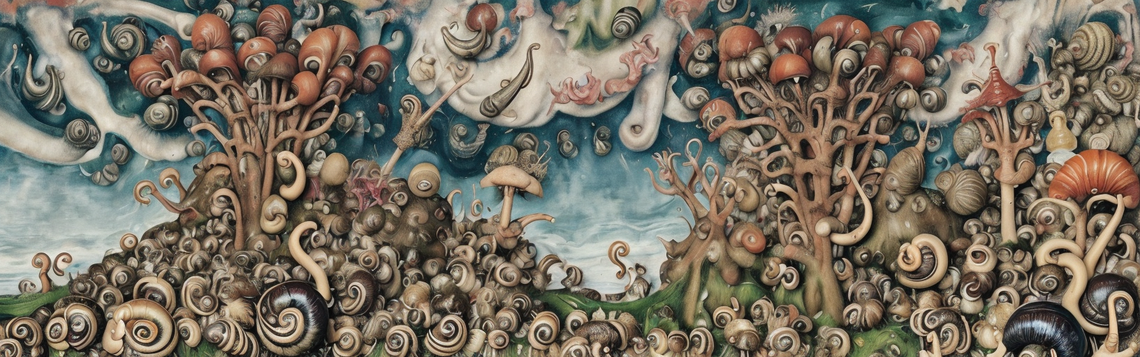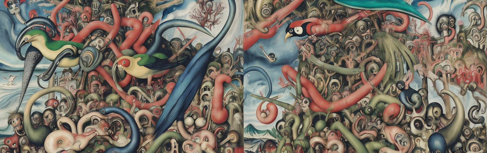 gave in various prompts - menitoning Audubon, Otto Dix, garden of Eden, snails, exotic birds etc.