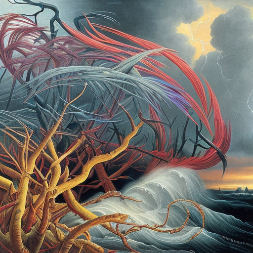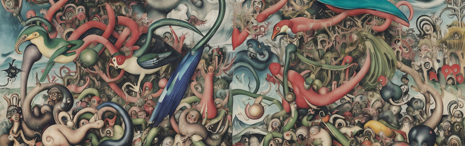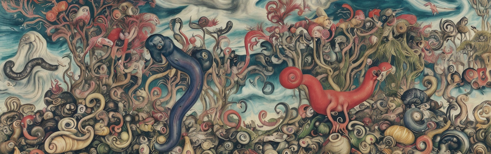 I plugged two imags into Stable Diffusion. A Raquib Shaw for the color palette. And a bowl of spaghetti for the structure and the lines